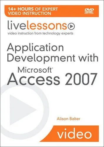 Application Development with Microsoft® Access 2007 Live Lessons Microsoft Access/Databases For Access power users, programmers, and anyone who wants to master Access 2007 development fast. In Application Development with Access 2007, renowned Access developer, trainer, and author Alison Balter teaches all the skills you need to build professional-quality Access 2007 applications. This package brings together more than twelve hours of personalized, expert video training: 100+ quick, practical video lessons that demonstrate all the skills you need to build virtually any Access application. You’ll learn one step at a time, at your own pace–using hands-on examples that reflect realistic development challenges and showcase Access 2007’s remarkable capabilities. Application Development with Access 2007 delivers the power of the best classroom training at a small fraction of the cost. If you don’t have time to read a huge book on Access development, this is exactly what you’ve been searching for! Looking for a better way to master today’s rapidly changing programming technologies? Want expert help, but don’t have the time or energy to read a book? Can’t find classroom training worth the money? Discover LiveLessons: self-paced, personal video instruction from the world’s leading technology experts. LiveLessons are video courses, on DVD with a book supplement, that are organized into bite-sized, self-contained sessions–you’ll learn key skills in as little as fifteen minutes! Each lesson begins with well-defined learning objectives and ends with comprehensive summaries, which help you track your progress. Follow along as your instructor shows how to get results in today’s top development environments: including Microsoft’s Visual Studio and eclipse.org’s Eclipse. “We are reaching more and more for video alternatives because they make sense! The imprints of Pearson Technology Group are the most trusted source of quality technology books, and they will be the brands we turn to for visual learning.” –Leo J. Hauguel, Information Security Analyst 5 Wells Fargo Services Company Alison Balter, one of the world’s most experienced Access developers and trainers, has created Access applications ranging from small end-user projects to enterprise-wide systems. Her thirteen books on Access include Alison Balter’s Mastering Microsoft Office Access 2007 Development. System Requirements Operating System: Windows 98, 2000, XP, or Vista; Mac OS X; versions of Linux with the Flash 8 Player or later Multimedia: DVD drive, an 800x600 or higher display, and sound card with speakers Computer: 500MHz or higher, 128MB RAM or more $69.99 U.S. / $76.99 CANADA / £44.99 Net UK
