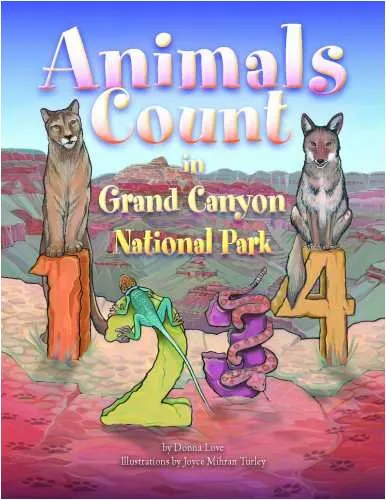 Grand Canyon is one of the prettiest places on earth, but deep inside its rocky walls and shaded beneath its towering rim forests, animals count the park as home, too. Animals Count in Grand Canyon National Park is a picture book for children ages 3 to 6 that features the many animals of Grand Canyon helping the young reader count to ten. Readers will meet two collared lizards, three Grand Canyon rattlesnakes, six humpback chubs, seven California condors, nine canyon tree frogs, ten big brown bats, and many more friends, each telling you a little about their lives in their amazing home. The wilderness of Grand Canyon teems with life, and this delightful book will open the world of the canyon and its wild citizens to readers while they learn to count. Colorful illustrations by artist Joyce Mihran Turley bring the stealthy, sure-footed, curious, croaking, and slithering wild animals of Grand Canyon National Park to life. Parents who wish to teach their children about the wildlife of our natural world will love this easy-to-read, beautifully designed tribute to the national park’s many furry, finny, hoofy, scaly, feathered, and slippery creatures.